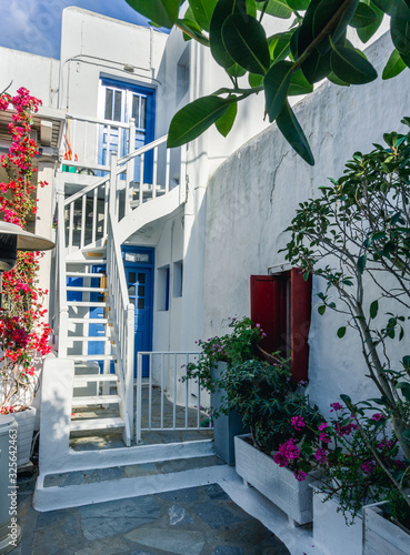 © Andressa, Naklejka premium Colorful houses, blue and red doors and windows and lots of flowers in the old town of Mykonos Island, Greece.