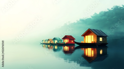 © CHA, Fototapeta premium Colorful Houses on Water at Dawn with Reflection