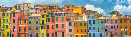 Fototapeta premium Colorful houses stacked closely together under a bright blue sky, creating a...
