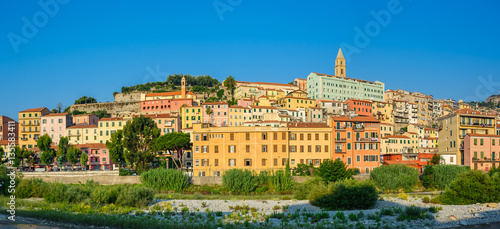 Obraz premium Colorful houses under blue sky in old town of Ventimiglia, Italy.