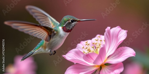 Fototapeta premium Colorful hummingbird feeding on vibrant pink flower with delicate petals...