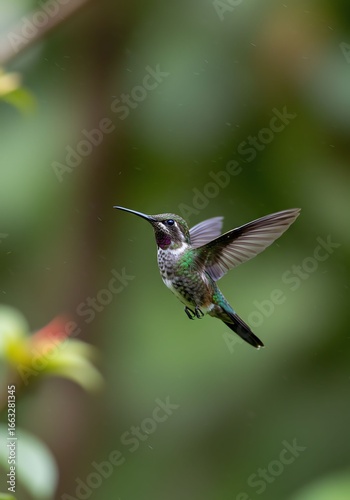 © St Mmh, Naklejka premium Colorful Hummingbird Flying in Natural Green Garden Scene