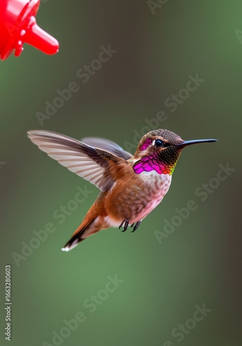 © St Mmh, Fototapeta premium Colorful Hummingbird Flying Near Red Feeding Tube in Natural Green Background