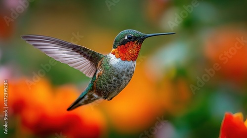 Fototapeta premium Colorful Hummingbird Hovering Against a Vibrant Orange Background