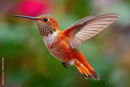 Obraz premium Colorful hummingbird hovering in a vibrant garden, capturing the essence of...