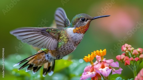 © venusvi, Naklejka premium colorful hummingbird hovering in front of a blooming flower, its wings beating rapidly.