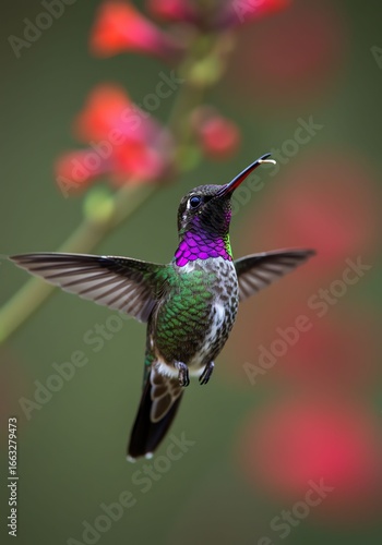 © St Mmh, Fototapeta premium Colorful Hummingbird Hovering Near Pink Flower in Natural Setting