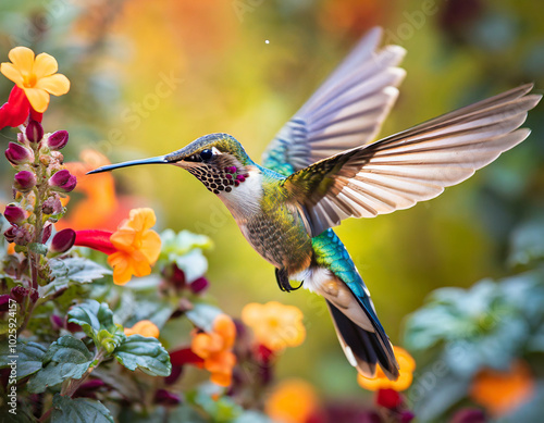 Obraz premium Colorful hummingbird hovering near vibrant flowers in a sunny garden during...