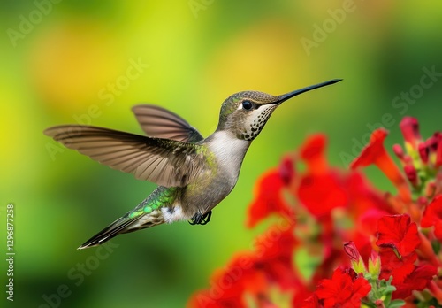 © Mardhiah, Fototapeta premium Colorful Hummingbird Hovering Near Vibrant Red Flowers in Bright Garden Environment During Sunny Day in Nature's Serene Beauty