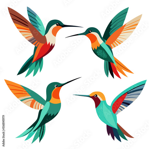 © Ashiqur, Naklejka premium Colorful Hummingbird Illustration A Vibrant Collection of Four Birds in Flight with Geometric Wing Patterns Perfect for Nature Themed Designs and Artistic Projects on a