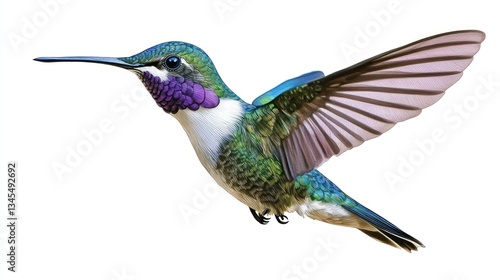 Fototapeta premium Colorful hummingbird in flight against white background. Possible use Stock...