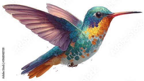 © RANO AKTER SANTA, Naklejka premium Colorful hummingbird in flight with spread wings flying vibrant