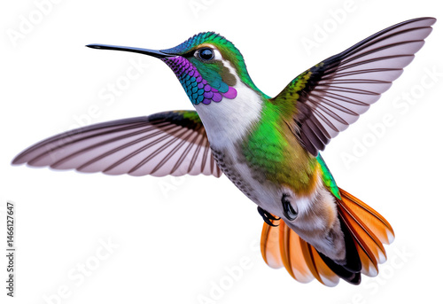 © Thanh, Obraz premium Colorful Hummingbird in Mid-Flight Against White Background