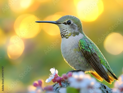 © tunanon, Fototapeta premium Colorful Hummingbird Sitting on Flower with Golden Bokeh Background