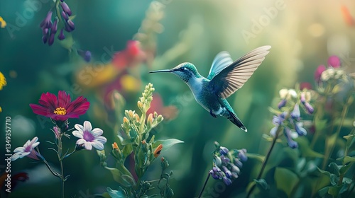 Naklejka premium Colorful hummingbirds and flowers in nature, with a cyan color scheme.