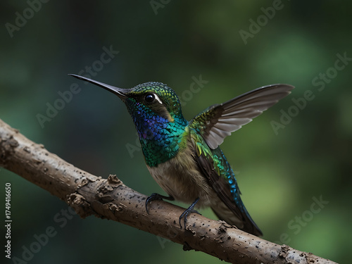 © Iqra, Obraz premium "Colorful hummingbirds and terns flying and perched on branches in nature, vibrant green and blue feathers, wildlife photography concept, tropical bird collection, nature and freedom background"