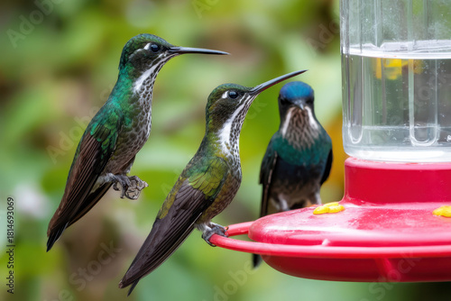 Fototapeta premium Colorful hummingbirds feeding at a nectar dispenser in a lush garden