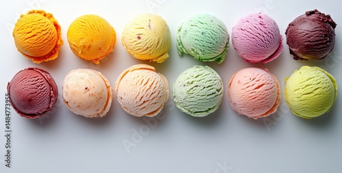 Fototapeta premium Colorful ice cream scoops arranged in a delightful display on a white surface...