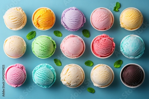 © Lubos Chlubny, Fototapeta premium Colorful ice cream scoops with mint leaves on blue background