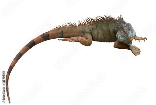Obraz premium Colorful iguana lies on her stomach. Isolated on white
