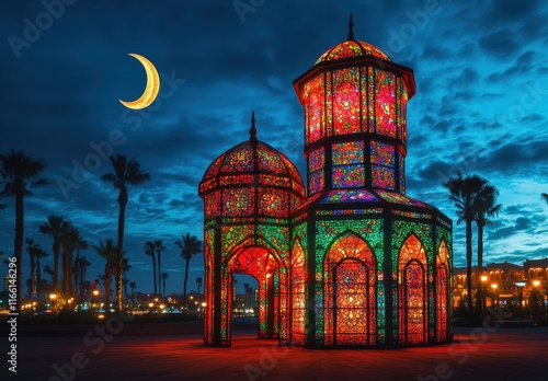 © ANUAR, Obraz premium Colorful illuminated pavilion against a twilight sky with crescent moon in a vibrant landscape, showcasing intricate patterns and reflections in Morocco-inspired architecture
