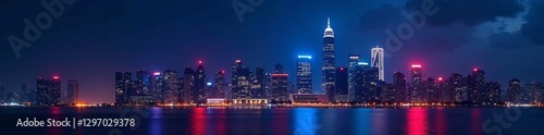 © Boonyapawn, Fototapeta premium Colorful illuminated skyscrapers against dark sky, architecture, buildings, illuminated