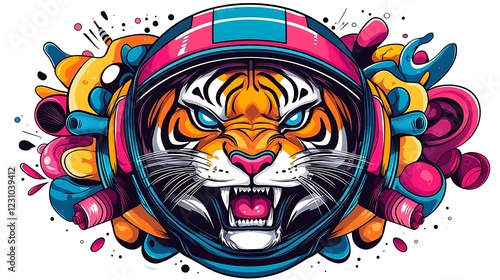 Obraz premium Colorful illustration of a fierce tiger wearing a space helmet surrounded by vibrant abstract shapes