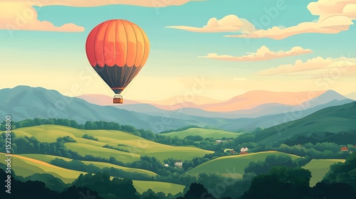 © Hanako, Fototapeta premium Colorful illustration of a hot air balloon over a picturesque valley landscape.