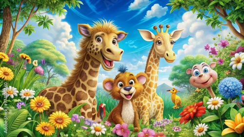 © Arnada, Fototapeta premium Colorful illustration of a whimsical zoo scene featuring a smiling giraffe, monkey, and lion surrounded by lush
