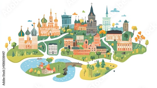 © Ariestia, Obraz premium Colorful Illustration of Buildings and Landscape in a City