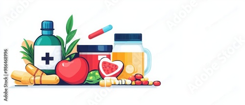 Fototapeta premium Colorful illustration of health-related food items, vitamins, and medicine...