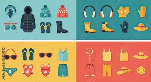 Fototapeta premium Colorful illustrations of clothing items representing different seasons and weather conditions