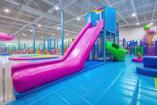 Naklejka premium Colorful Indoor Playground Featuring Vibrant Slides and Interactive Play Structures for Children's Fun and Entertainment in a Safe Environment