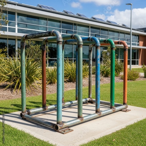 © jmdesigns608, Fototapeta premium Colorful industrial pipe sculpture in front of modern building