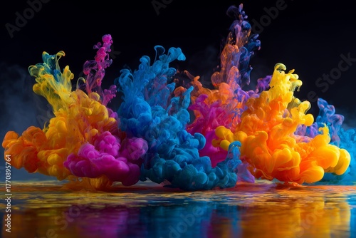 © Nataliia, Fototapeta premium Colorful ink in shades of pink, orange, and blue swirls together underwater, creating a vivid abstract pattern full of depth and texture.