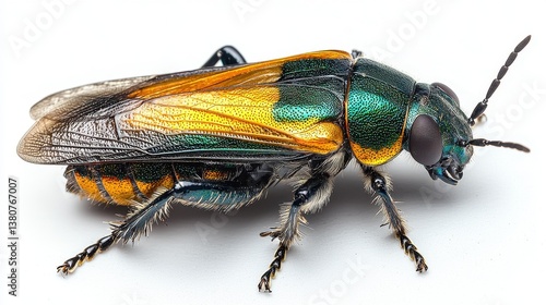 © warunthorn, Fototapeta premium Colorful Insect with Iridescent Wings Crawling on a White Surface