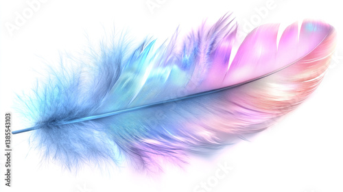 © Hanna, Obraz premium Colorful Iridescent Feather Displaying Blue and Pink Hues on a White Background