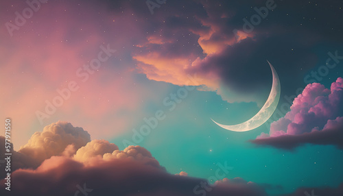 Fototapeta premium Colorful islamic ramadan greetings background with crescent moon over clouds