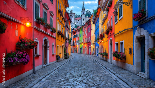 © Lailatul, Fototapeta premium Colorful Italian Street, Cobblestone Road, Hilltop Church, Dawn, Travel Poster.