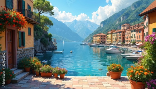 © Pete, Obraz premium Colorful Italian village houses line tranquil blue lake. Boats moor in clear turquoise water. Majestic mountains rise in background. Bright flowers adorn buildings, creating idyllic summer travel