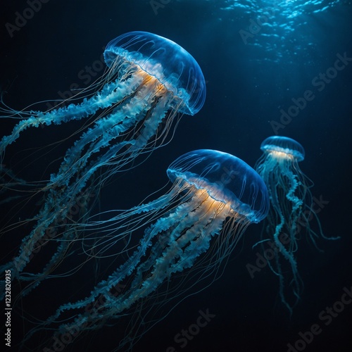 © Muhammad, Fototapeta premium Colorful Jellyfish a picture of jellyfish in the water with the words " jellyfish " Under the moonlit sky, bioluminescent jellyfish