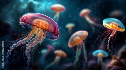 Fototapeta premium Colorful jellyfish float gracefully in a deep blue ocean, creating an...