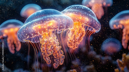 © Sangsung, Fototapeta premium Colorful Jellyfish Underwater with Glowing Effects