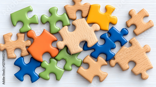 © bcendet, Obraz premium Colorful jigsaw puzzle pieces scattered on white surface. Teamwork concepts