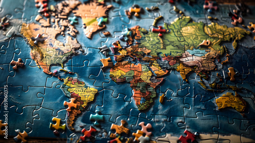 Fototapeta premium Colorful jigsaw puzzles come together to create a map. Each piece reveals a unique region. and connected to each other The complete map emphasizes the diversity and unity of the various areas.