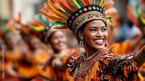 © Cheewynn, Fototapeta premium Colorful Kadayawan Festival parade, traditional dancers in ornate costumes, joyfully performing cultural dances in the bustling streets