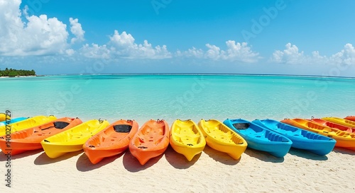 © luwie, Obraz premium Colorful kayaks lined up on shoreline beside clear turquoise water