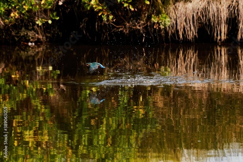 Fototapeta premium colorful kingfisher in flight is reflected in the water surface