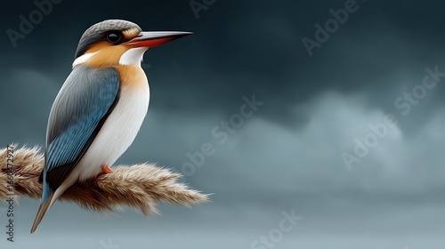 © Finder, Obraz premium Colorful Kingfisher Perched on Grass Against Dramatic Stormy Sky Background in Tranquil Nature Scene
