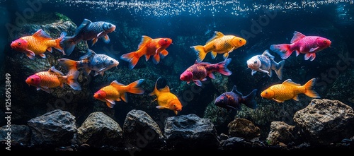 Fototapeta premium Colorful Koi fish swim in aquarium, rocks background, aquatic scene, home decor